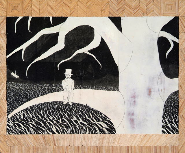 Mixed media, graphite, watercolor, coffee, toothpicks, on board with wood filler / 12" x 11.5" / 2008